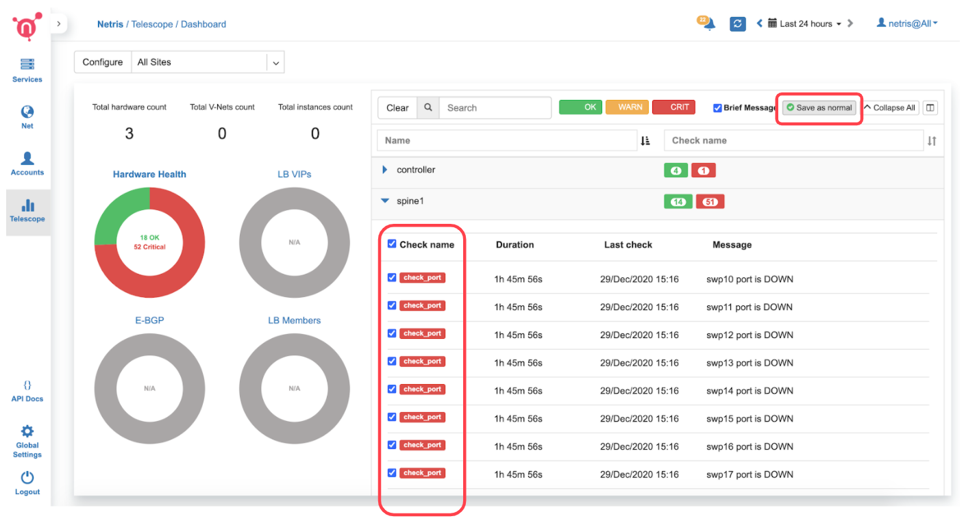 Telescope → Dashboard summarizes Network Health, which can also be accessed by clicking on the Netris icon in the top left corner.